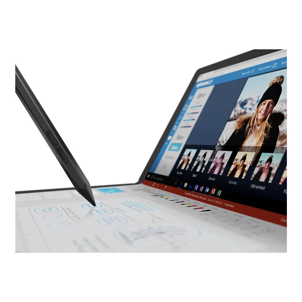 El corazón del X1 Fold es su impresionante pantalla plegable OLED de 13.3 pulgadas QXGA (2048×1536). Con un brillo de 300 nits, tecnología antihuellas y una cobertura del 95% DCI-P3, este panel táctil ofrece colores vibrantes, negros puros y una nitidez excepcional para el trabajo y el entretenimiento. La capacidad de plegarse te permite usarlo como un libro, una tablet grande o un portátil compacto.
